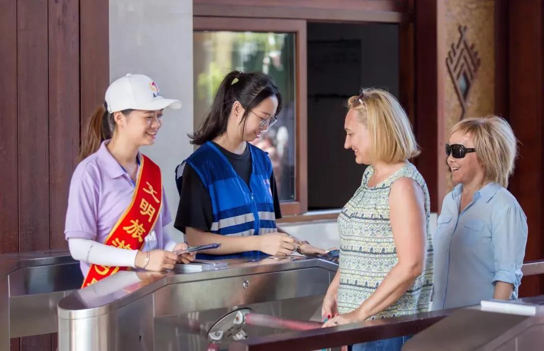 在入園檢票口,工作人員每天用溫暖的笑容做好迎接游客的第一站,以溫馨的態(tài)度服務(wù)好每一位游客。勤勞、認(rèn)真、一絲不茍是她們標(biāo)簽,真誠(chéng)而貼心的服務(wù)猶如一股清風(fēng)吹散了游客們的暑氣與煩躁。