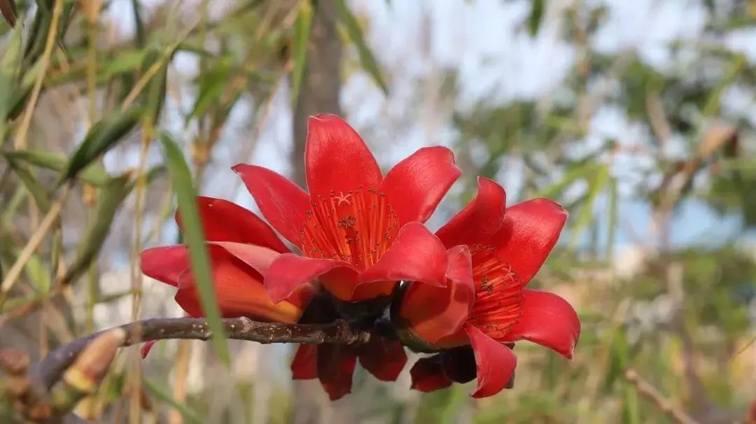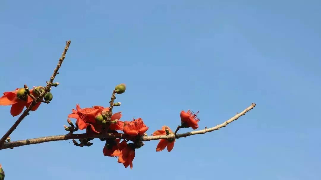 木棉花開了,夕陽霞光照,葉綠影參差,挺拔的棕褐色枝干上綻放著一朵又一朵的木棉花,仿佛一個(gè)個(gè)火紅的小太陽溫暖的照耀著人間。