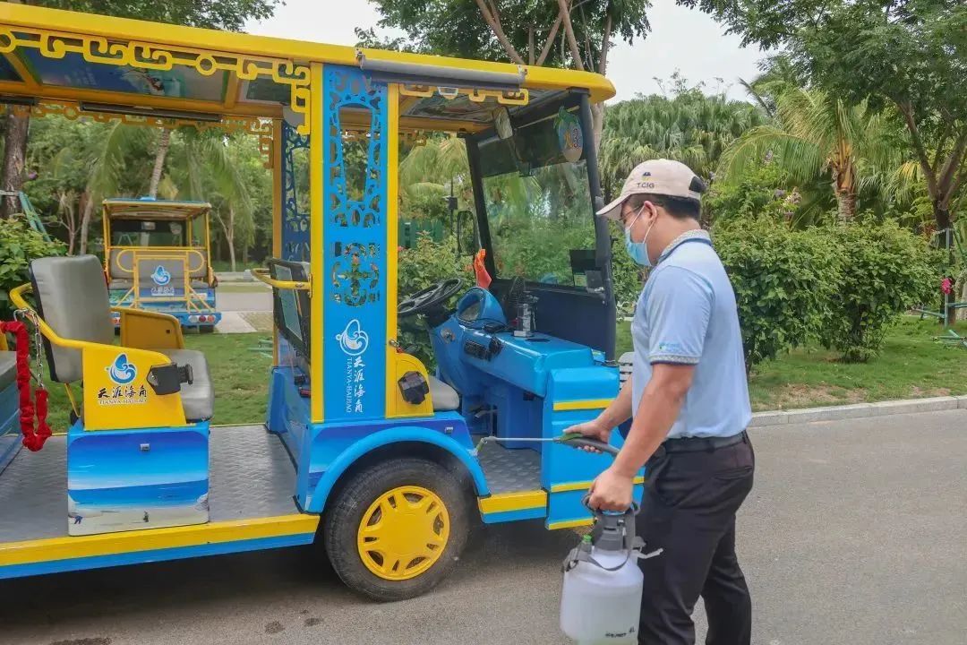 受疫情影響停業(yè)期間,三亞旅文集團成員景區(qū)仍然堅持定期對景區(qū)大門口通道、售票大廳、游客中心、游覽車站等重點區(qū)域進行全面消毒工作。
