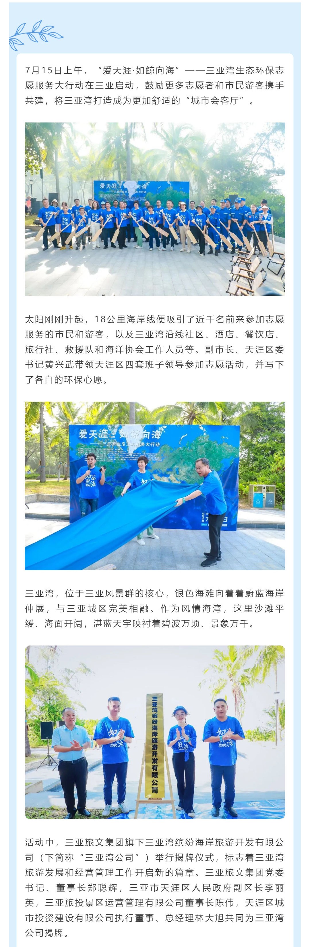 “如鯨向?!碧煅纳鷳B(tài)旅游路線啟動,三亞灣繽紛海岸旅游開發(fā)有限公司舉行揭牌儀式