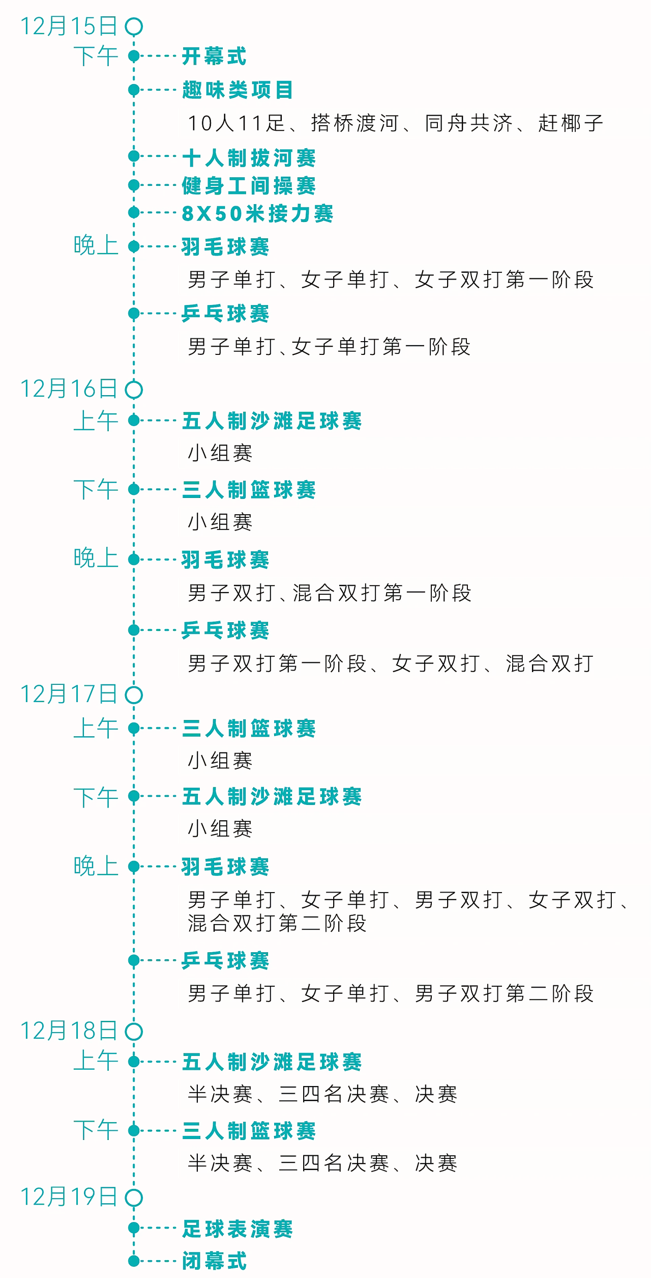 本次運(yùn)動(dòng)會(huì)突破傳統(tǒng)運(yùn)動(dòng)會(huì)形式,體現(xiàn)三亞濱海特色,玩轉(zhuǎn)新玩法,打造多巴胺式運(yùn)動(dòng)嘉年華。運(yùn)動(dòng)會(huì)為期一周,設(shè)有競(jìng)技類和趣味類兩大項(xiàng)目。競(jìng)技類項(xiàng)目包括五人制沙灘足球賽、三人制籃球賽、羽毛球賽、乒乓球賽、8x50米接力賽、十人制拔河賽、健身工間操賽等,趣味類項(xiàng)目包括10人11足、搭橋渡河、同舟共濟(jì)、趕椰子等。比賽將在國(guó)際體育中心訓(xùn)練場(chǎng)、天涯海角游覽區(qū)西區(qū)亞沙會(huì)比賽場(chǎng)地等地進(jìn)行。