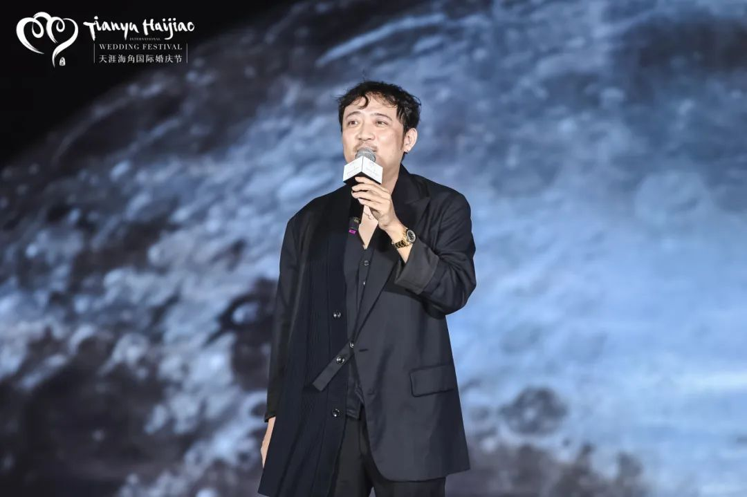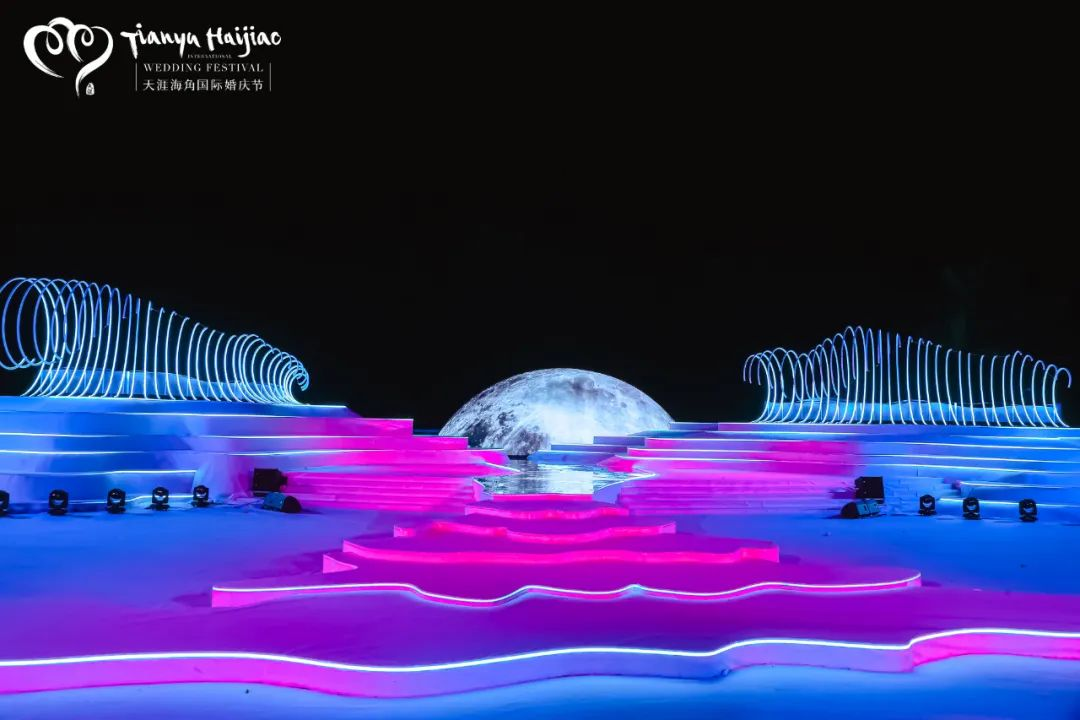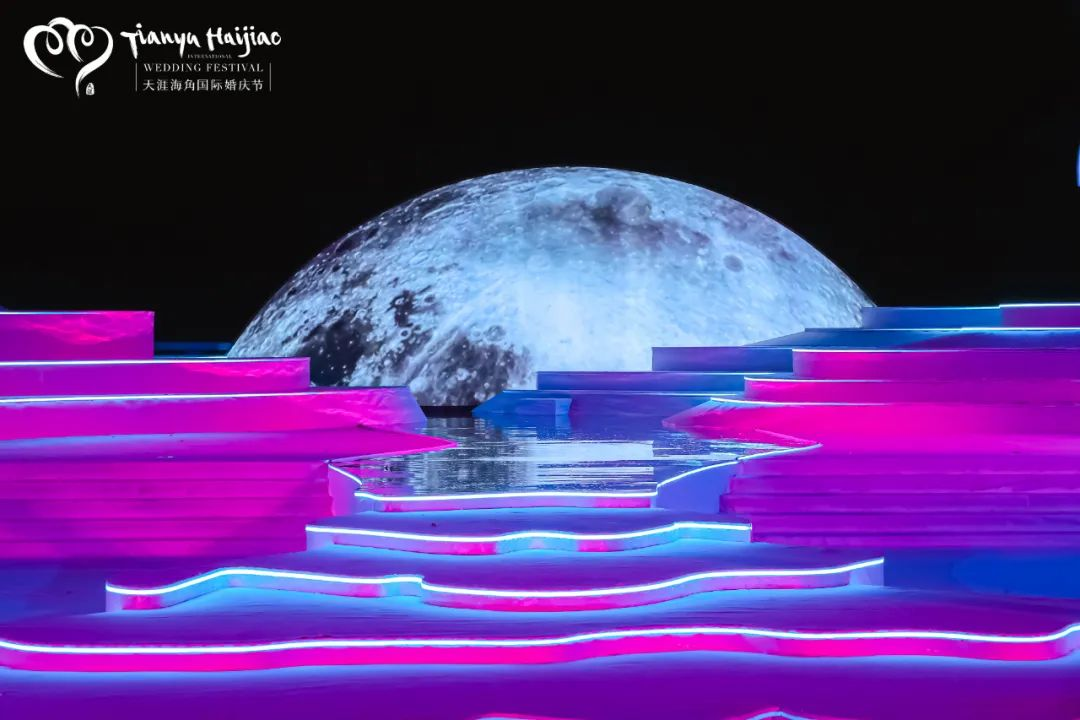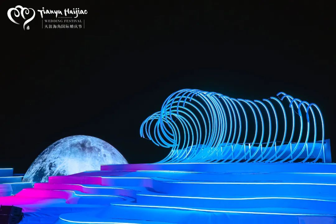 據(jù)開幕式主舞臺設(shè)計師徐丹介紹,此次舞臺設(shè)計簡單明了地采用了“海上生明月 天涯共此時”這句家喻戶曉的古詩詞概念,兩端采用動感的白色海浪烘托著舞臺中間“升起的明月”,并配合多彩燈光營造出波浪涌動的動感效果,在日月石前營造出浪漫的婚禮場景,恰如其分地契合了婚慶節(jié)“天時地利人和”等特定元素。舞臺梯臺設(shè)計靈感源于天涯海角海景涌動的浪花層疊造型,讓參加天涯婚典的新人們更好地融入舞臺,舞臺中央的鏡面通道猶如月亮女神穿著婚紗造型,會隨著燈光的變幻呈現(xiàn)出舞動的婚紗夢幻感。據(jù)了解,徐丹是中央電視臺二套財經(jīng)頻道特約設(shè)計師、中國三亞目的地婚禮全國推廣大使。