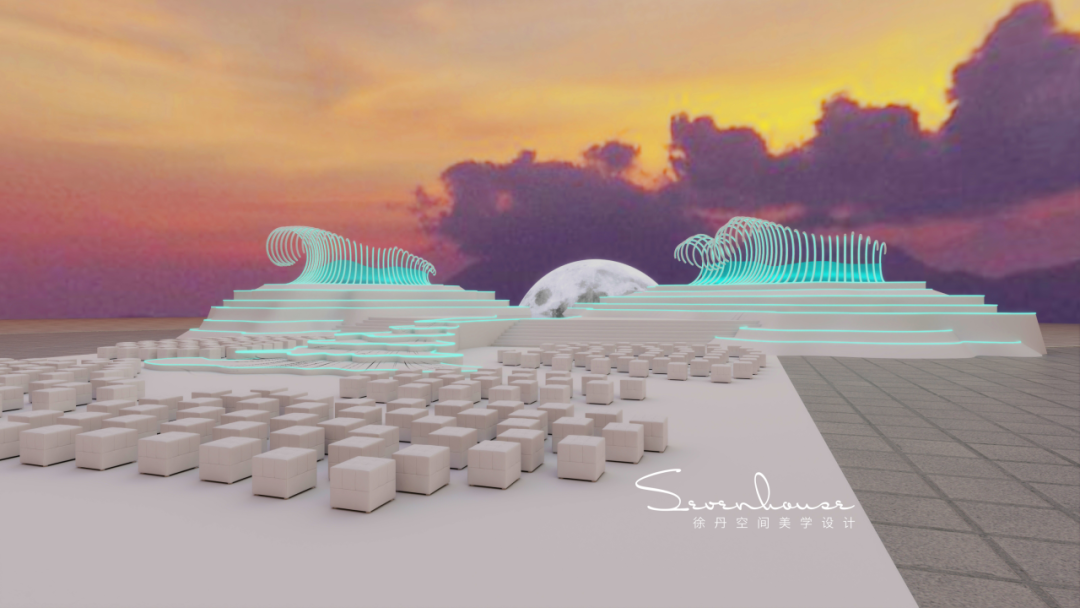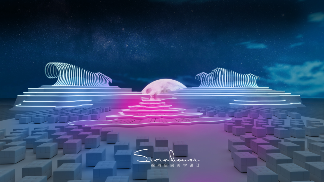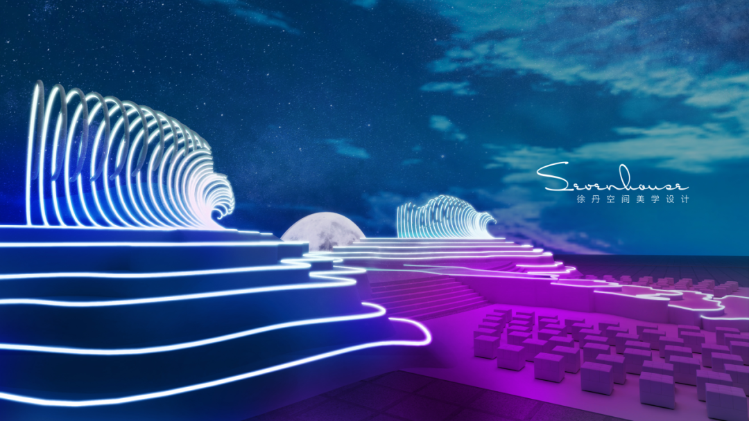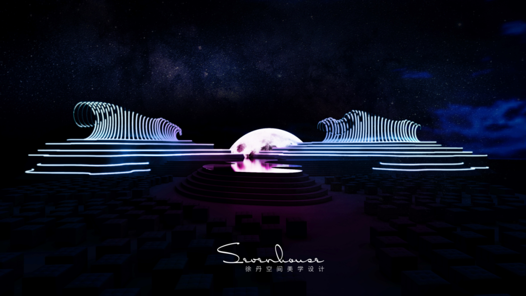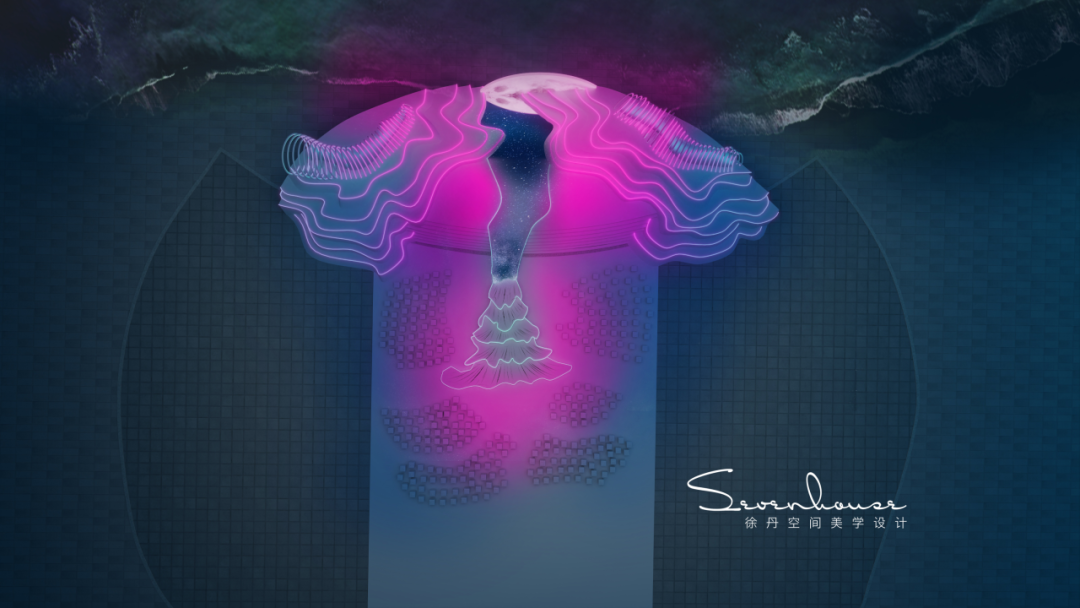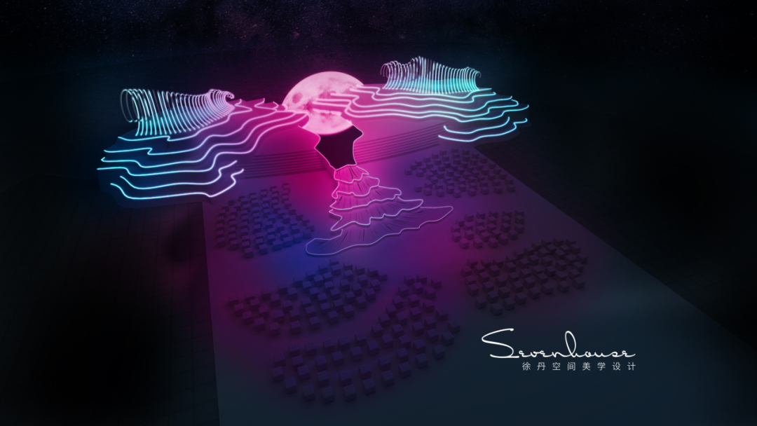 梯臺設(shè)計靈感來源于婚紗的裙擺,整個梯臺聯(lián)通主舞臺的鏡面通道猶如一個月亮女神穿起了美麗的婚紗