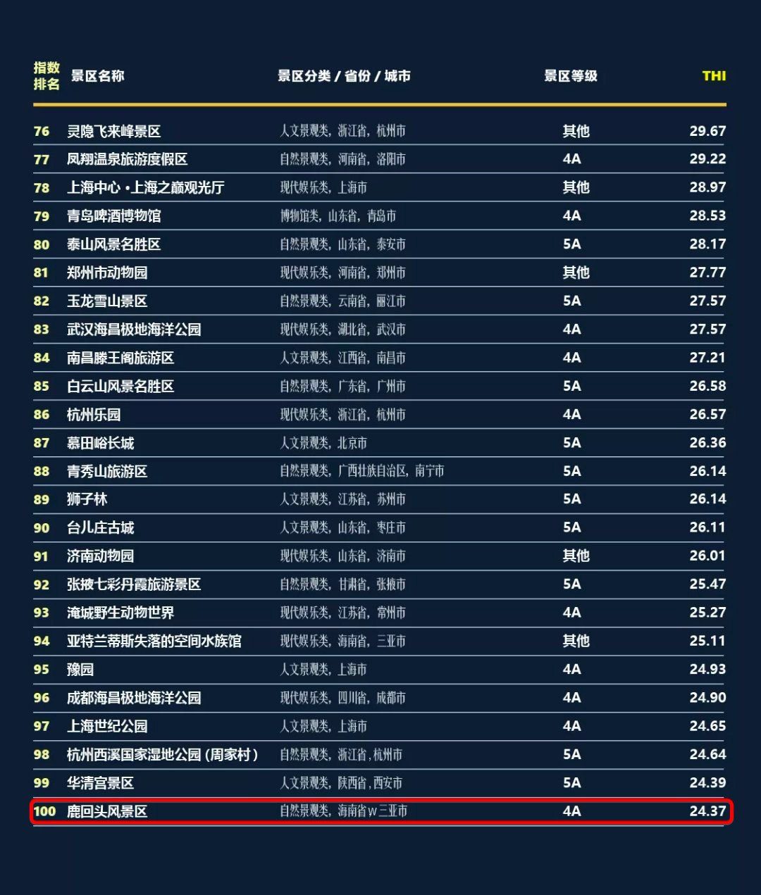 4月20日,由中國旅游景區(qū)協(xié)會(huì)和華僑城創(chuàng)新研究院聯(lián)合研發(fā)編制的“中國旅游景區(qū)歡樂指數(shù)(THI)”正式發(fā)布。此次發(fā)布的指數(shù)包括“中國旅游景區(qū)歡樂指數(shù)(THI)排名前100名”和中國旅游景區(qū)自然景觀類、人文景觀類、博物館類、鄉(xiāng)村田園類、現(xiàn)代娛樂類等分類歡樂指數(shù)前20名,其中鹿回頭風(fēng)景區(qū)依依上榜。