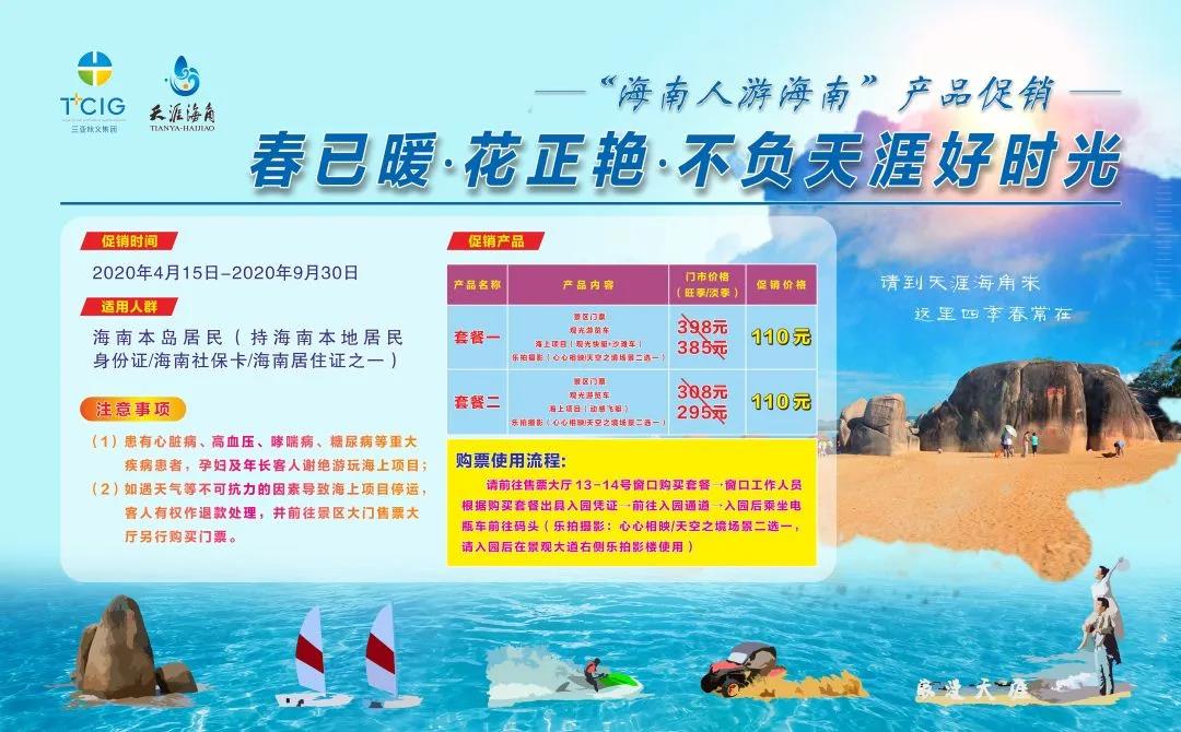 2020年4月15日至9月30日,海南本島居民持海南本地居民身份證、海南社保卡、海南居住證之一均能以110元/人的優(yōu)惠價(jià)格購(gòu)買原價(jià)300元左右的景區(qū)門(mén)票與玩海項(xiàng)目的組合套餐。