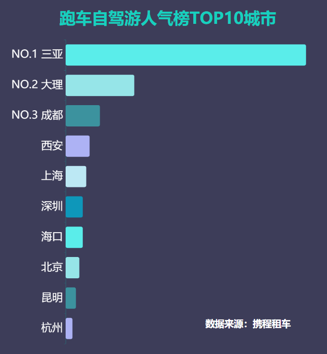 據(jù)攜程統(tǒng)計(jì)數(shù)據(jù)顯示,在近期全國租車訂單中,海南一省就占了70%,遠(yuǎn)遠(yuǎn)超過其它省份,成為跑車自駕游第一省。海南跑車訂單主要分布在三亞、??凇⒘晁?,三亞占了絕大部分。此外,統(tǒng)計(jì)數(shù)據(jù)顯示,三亞成為國內(nèi)租車、租跑車人氣城市“雙料冠軍”。攜程租車發(fā)布“跑車自駕游人氣榜TOP10城市”分別是:三亞、大理、成都、西安、上海、深圳、???、北京、昆明、杭州。三亞以70%以上的占比位居全國第一,成為“跑車之都”。