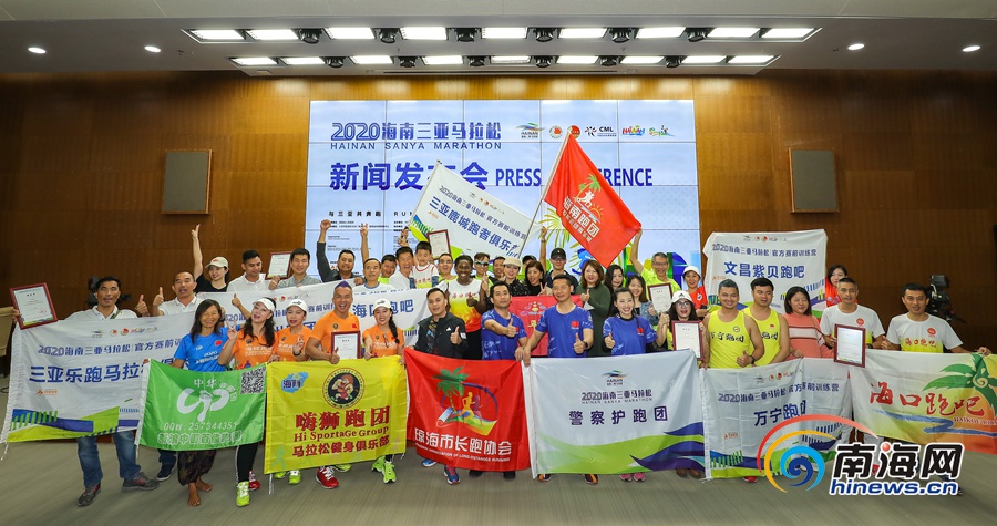 參加2020海南三亞馬拉松賽的各個跑團(tuán)合影。 南海網(wǎng)記者陳望 攝