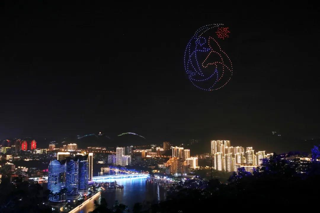 2020年第六屆亞洲沙灘運動會會徽及口號發(fā)布儀式在三亞鹿回頭風(fēng)景區(qū)舉行。正式發(fā)布了亞沙會中英文口號“久久不見久久見”(see ya in sanya),以及由太陽光芒、海洋元素和海南代表物共同組成的會徽。這對于海南首個洲際級別綜合運動會的籌備工作具有里程碑意義。圖為發(fā)布儀式上無人機在夜空中拼出亞沙會會徽。