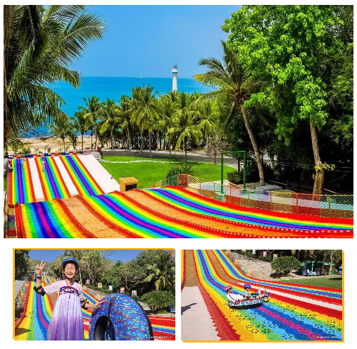 三條長達(dá)110米的滑道并排從南山之上一直延伸到南海之濱,宛若彩虹一般。呈波浪形態(tài)的滑道整體落差達(dá)到了20米,直沖而下,刺激無限。