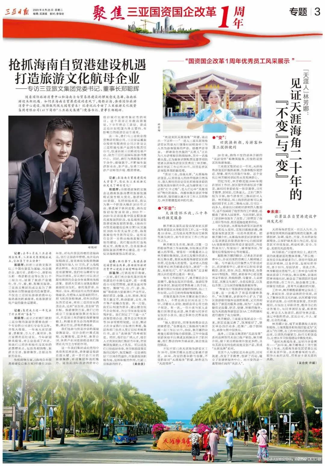 鄭聰輝:打鐵還需自身硬。一方面,我們充分依托集團現(xiàn)有資源進行市場化運作,進一步提高公司經(jīng)營管理、融資及盈利等能力。圍繞“吃、住、行、游、購、娛”等旅游六要素進行產(chǎn)業(yè)布局,做好項目、金融、土地、招商、制度等五篇文章,推動旅游、文化、體育等產(chǎn)業(yè)融合發(fā)展。另一方面,我們以制度為抓手,建立健全現(xiàn)代企業(yè)制度,為公司快速發(fā)展保駕護航。我們制定了“三重一大”決策管理辦法、董事會議事規(guī)則等30余項管理制度。目前,集團正在全面推行目標責任考核,集團各部門負責人簽訂目標考核責任書,建立“真績效”的考核制度。同時,我們也廣納人才,吸引人才充實到我們集團當中來,夯實集團發(fā)展的人才隊伍。可以說我們已經(jīng)做好準備,在自貿(mào)港政策實施的過程中,旅文集團一定會承擔好三亞國企的重任,在旅游版塊積極布局,發(fā)揮積極的作用,扛起三亞旅游的擔子。