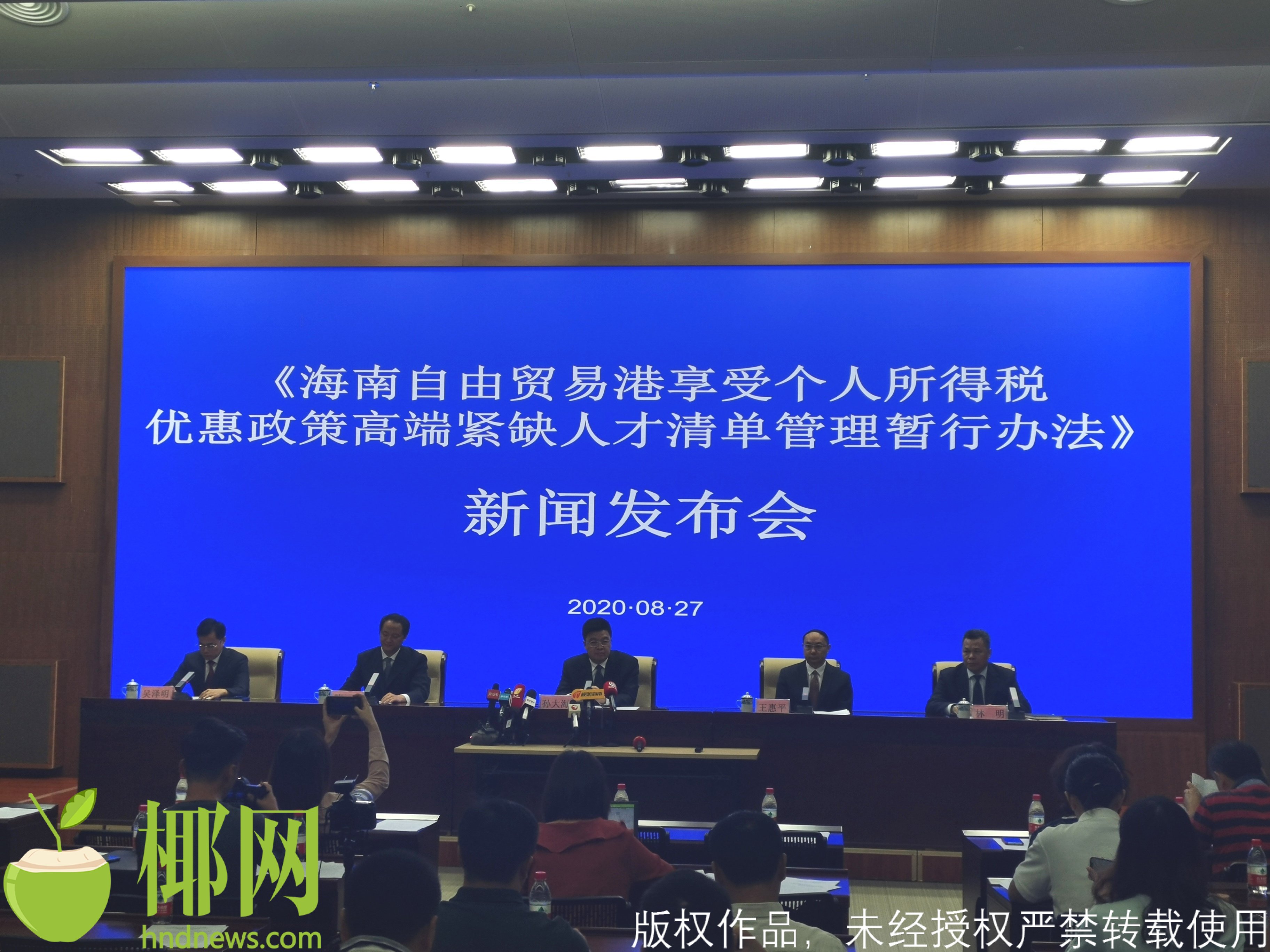 椰網(wǎng)/海拔手機端記者 陳王鳳 攝影報道)《海南自由貿(mào)易港享受個人所得稅優(yōu)惠政策高端緊缺人才清單管理暫行辦法》新聞發(fā)布會于8月27日上午在海口舉行,記者從發(fā)布會上獲悉,在海南自由貿(mào)易港,符合條件的境內(nèi)和境外高端人才和緊缺人才都適用15%個稅優(yōu)惠政策。