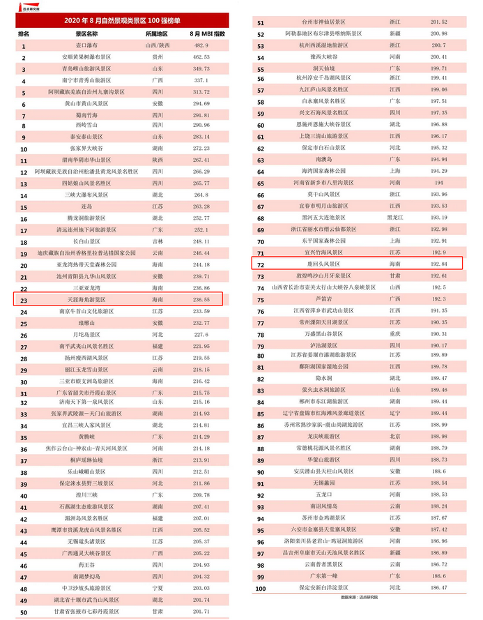 近日,國(guó)內(nèi)領(lǐng)先咨詢機(jī)構(gòu)邁點(diǎn)研究院發(fā)布了《2020年8月自然景觀類(lèi)景區(qū)100強(qiáng)榜單》,三亞旅文集團(tuán)成員企業(yè)天涯海角游覽區(qū)、鹿回頭風(fēng)景區(qū)分別以236.55MBI、192.84MBI指數(shù)強(qiáng)勢(shì)入圍百?gòu)?qiáng)榜單,分別位列第23和第72位。