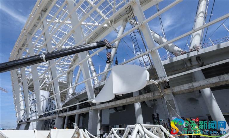 體育場項(xiàng)目立面膜“白鷺翅膀”面積為35平方米,弧長10米左右。第一批計劃安裝30個,整個外立面需要972個。目前,體育場四個面都在進(jìn)行骨架拼裝,已經(jīng)完成了100多個。