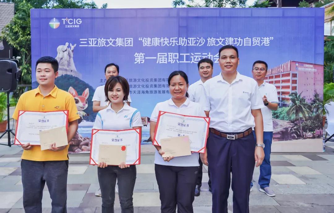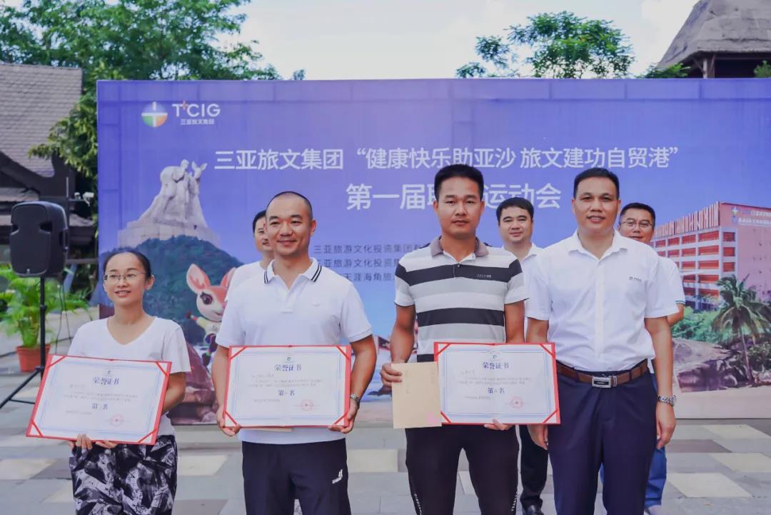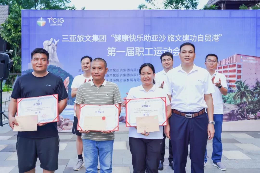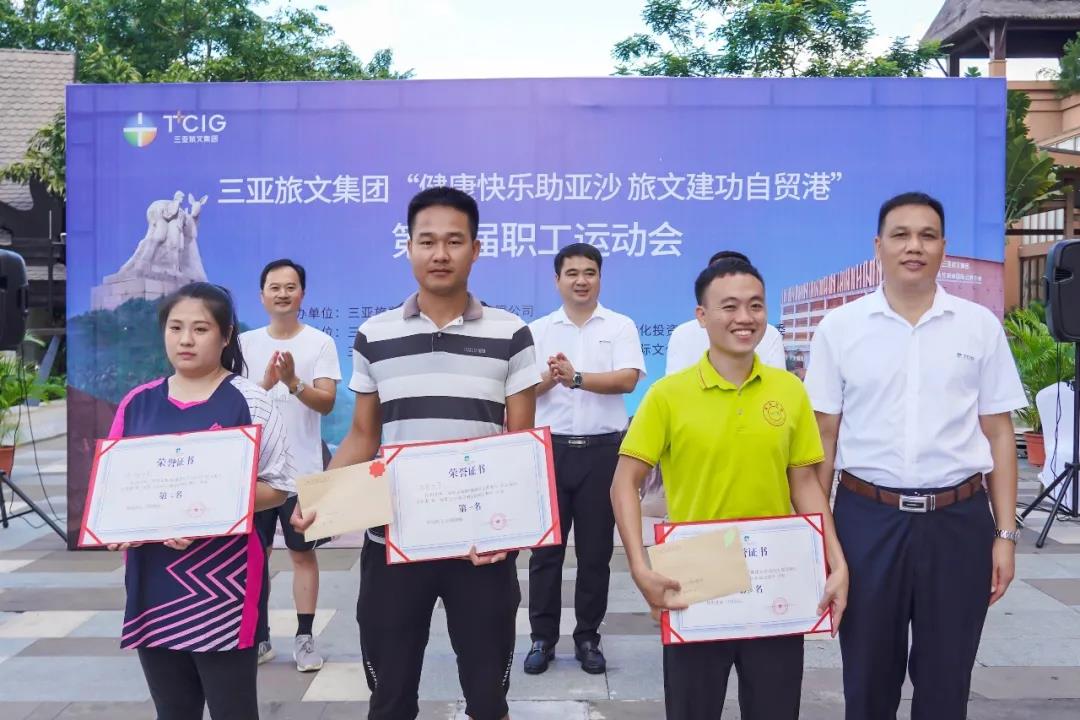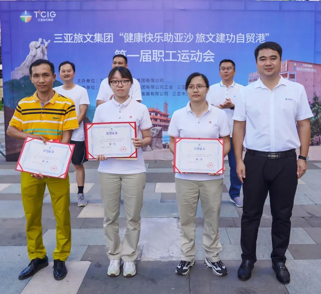 趣味運(yùn)動比賽后舉行了三亞旅文集團(tuán)第一屆職工運(yùn)動會頒獎儀式,三亞旅文集團(tuán)黨委副書記、紀(jì)委書記、工會主席戴彬森,三亞旅文集團(tuán)副總經(jīng)理劉勇,三亞旅文集團(tuán)工程總監(jiān)郭佳凡,三亞旅文集團(tuán)黨群工作部部長、工會副主席郭遠(yuǎn)盛出席頒獎儀式并為獲獎選手和隊(duì)伍頒獎。頒獎儀式由三亞旅文集團(tuán)團(tuán)委書記、綜合管理部經(jīng)理蒙繼偉主持。