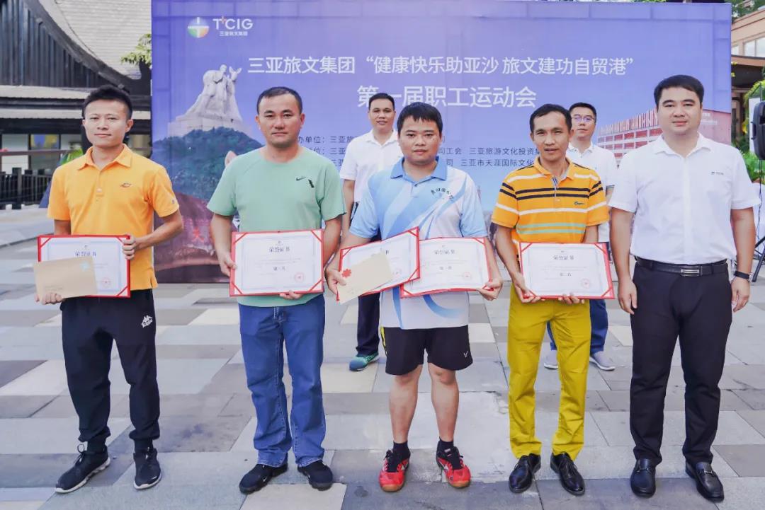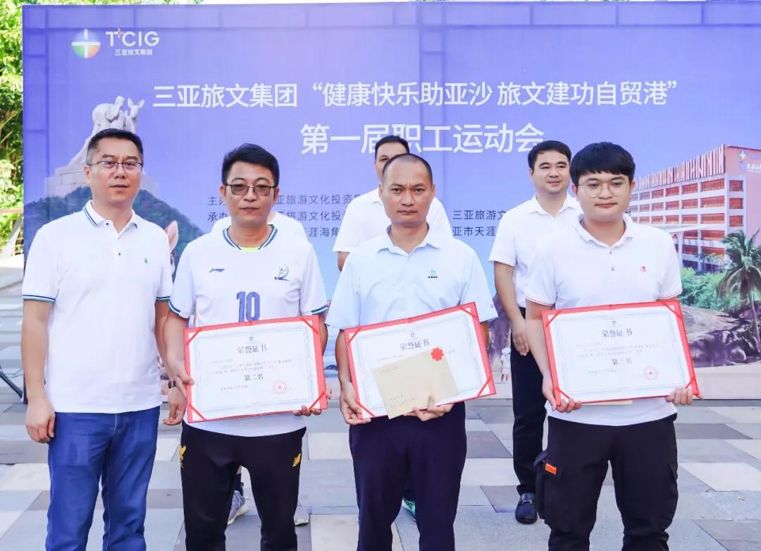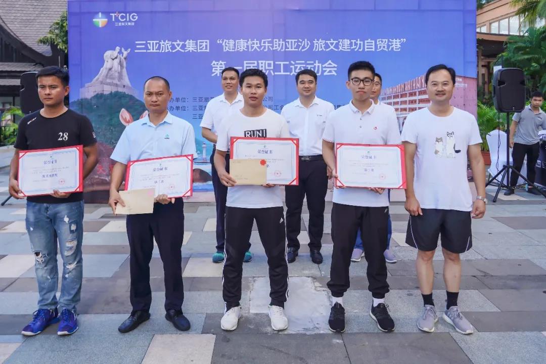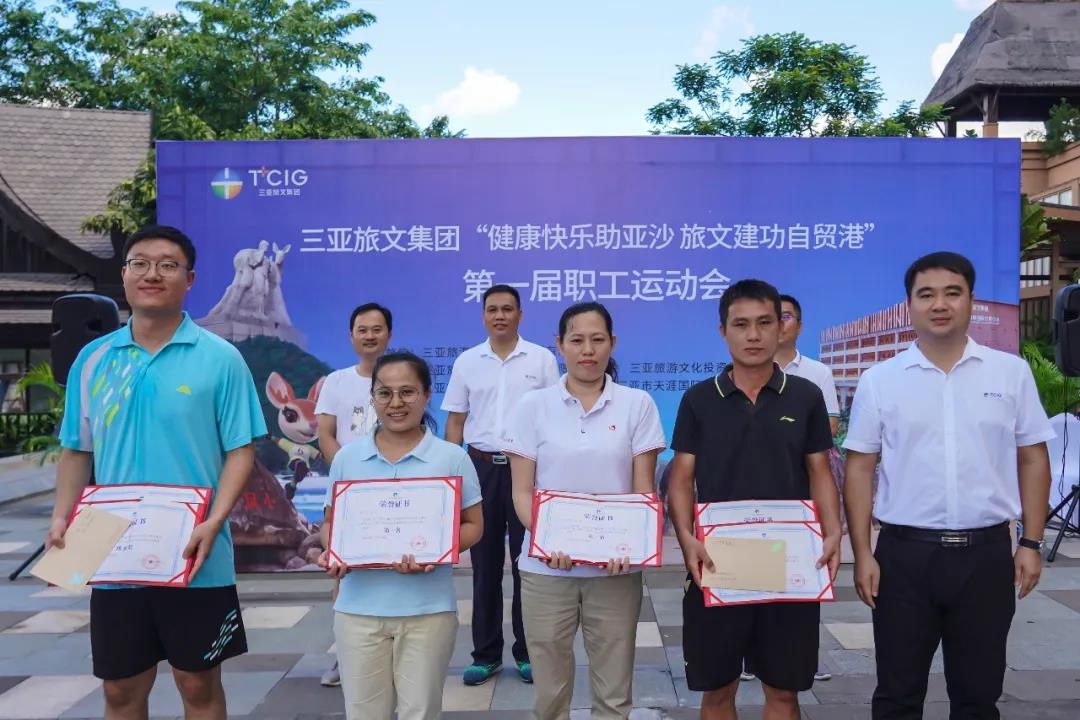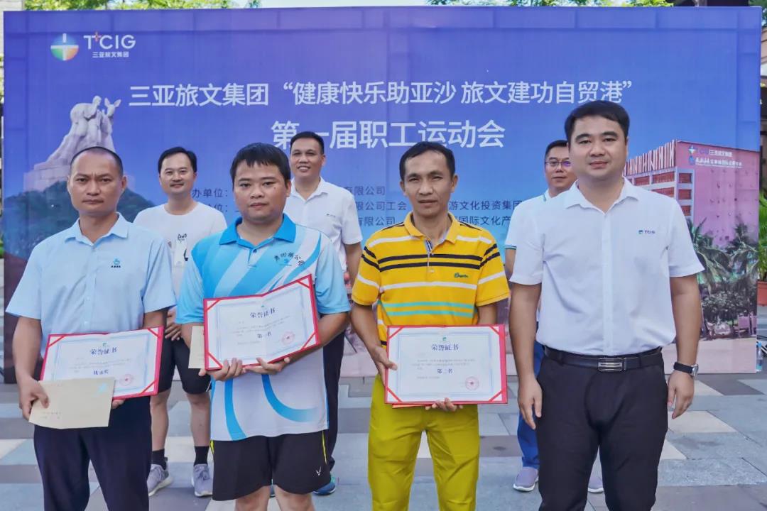 趣味運(yùn)動比賽后舉行了三亞旅文集團(tuán)第一屆職工運(yùn)動會頒獎儀式,三亞旅文集團(tuán)黨委副書記、紀(jì)委書記、工會主席戴彬森,三亞旅文集團(tuán)副總經(jīng)理劉勇,三亞旅文集團(tuán)工程總監(jiān)郭佳凡,三亞旅文集團(tuán)黨群工作部部長、工會副主席郭遠(yuǎn)盛出席頒獎儀式并為獲獎選手和隊(duì)伍頒獎。頒獎儀式由三亞旅文集團(tuán)團(tuán)委書記、綜合管理部經(jīng)理蒙繼偉主持。