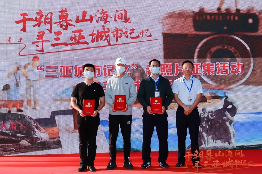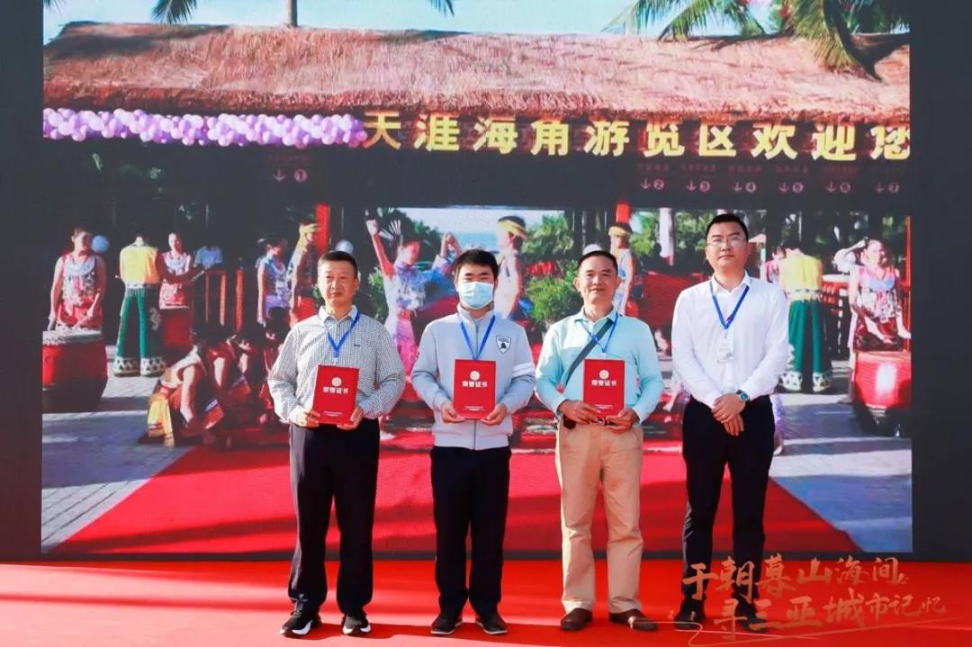 由天涯海角紀(jì)委書記伍博雅為獲得最美城市記憶獎的任志才、陳穎專、保繼剛頒獎