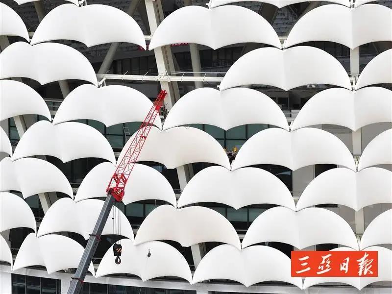 三亞國際體育產(chǎn)業(yè)園體育場立面膜“白鷺翅膀”施工完成。