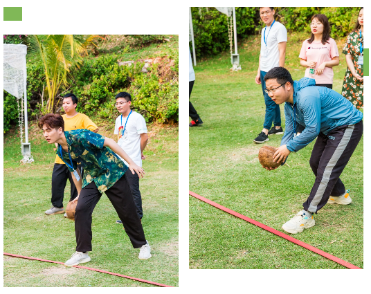 激動(dòng)人心的椰子保齡球環(huán)節(jié),隨著主持人講解規(guī)則完畢,兩支隊(duì)伍同時(shí)進(jìn)行比拼,大家互相討論著怎么才能擊倒更多保齡球瓶。